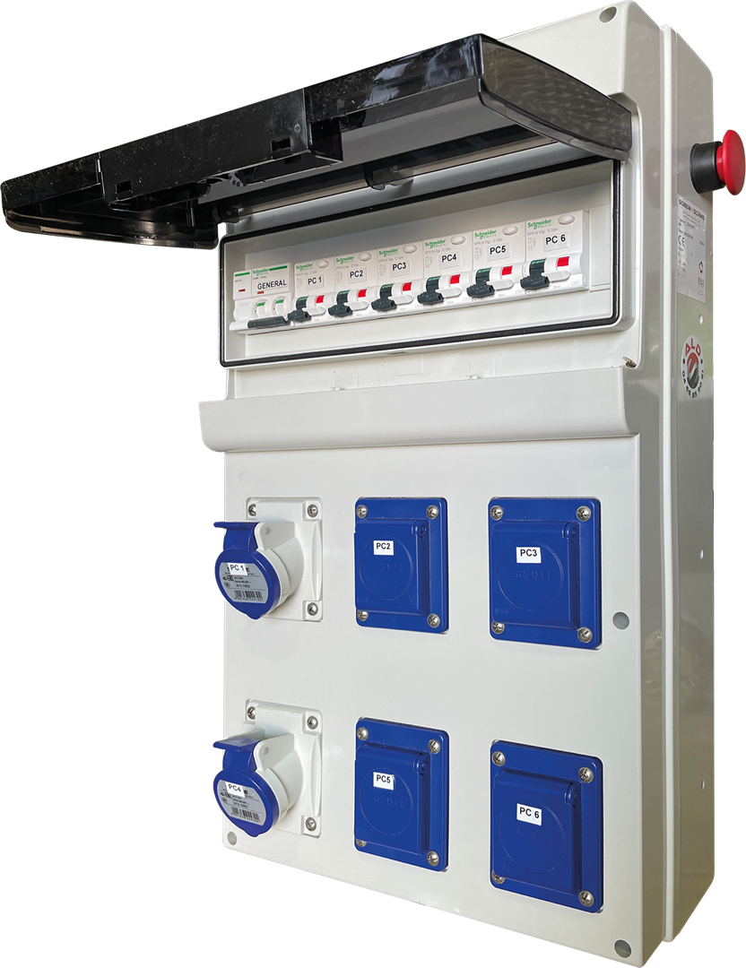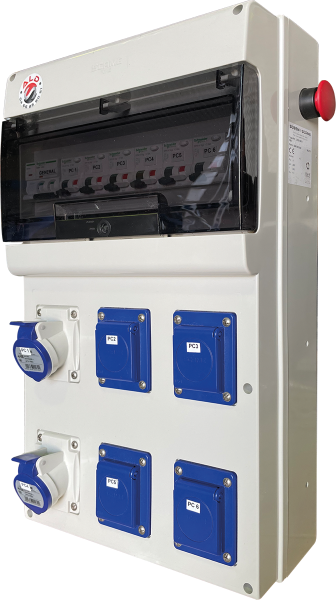 – 6 prises de courant 2 x 10/16A + T, 230V, IP44, protégées individuellement par disjoncteur différentiel 1 x 16A + N - 30mA.