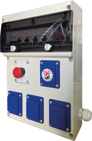 – 2 prises 3 x 16A + N + T, 400V, IP44, CEE, protégées individuellement par disjoncteur 3 x 16A + N – C.